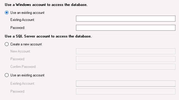 If you performed a Standard installation with an existing SQL Server database, select one of the following for authentication: -