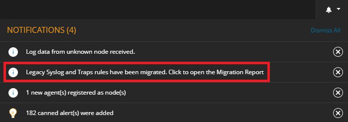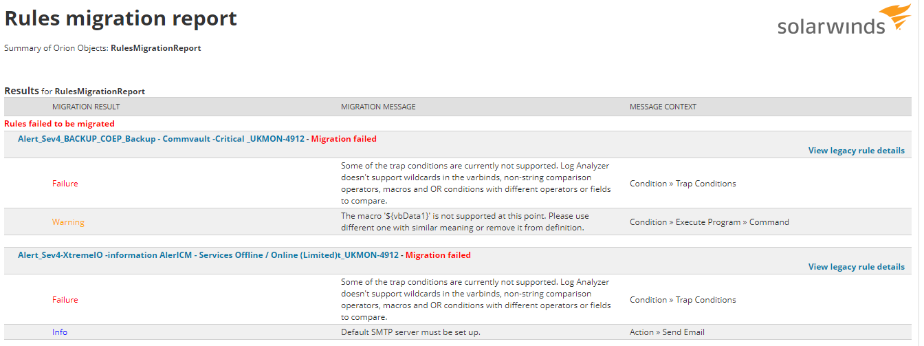 Once the rule migration is complete, a notification appears in the SolarWinds Platform Web Console with a link to the Rules migration report.