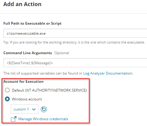 SolarWinds recommends that you create tailored low-privilege accounts on the machine to run specific external programs, scripts, and alert actions. See Secure external programs and script alerting actions for details.
