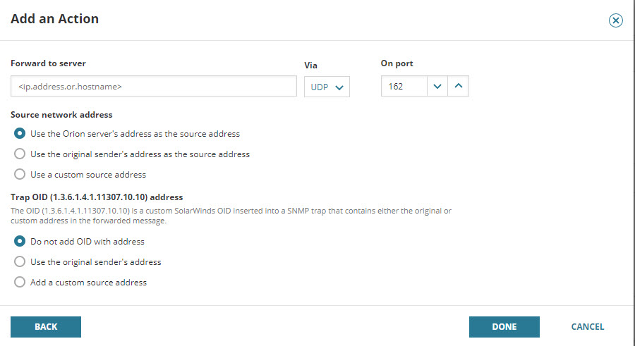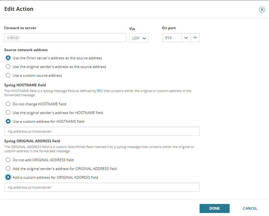 Enter the destination server IP and UDP port. For syslog forwarding, review the hostname and original address options.