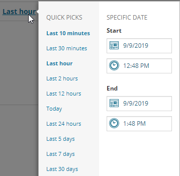 To set your time frame, open the custom time picker, select a quick pick option, or set a start and end date.
