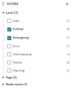The Filters pane displays all filters you can apply to event messages. All filters are stored in groups. To apply a filter to the events table, click to expand a filter group, and then select a filter. The events table refreshes and displays the incoming events allowed by the filter conditions. Click the Hide Pane icon to collapse the pane, or the Show Pane icon to expand it.