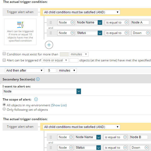 Then, in the secondary section, configure the actual trigger condition so that Node Name is equal to Node B and Node Status is equal to Down.