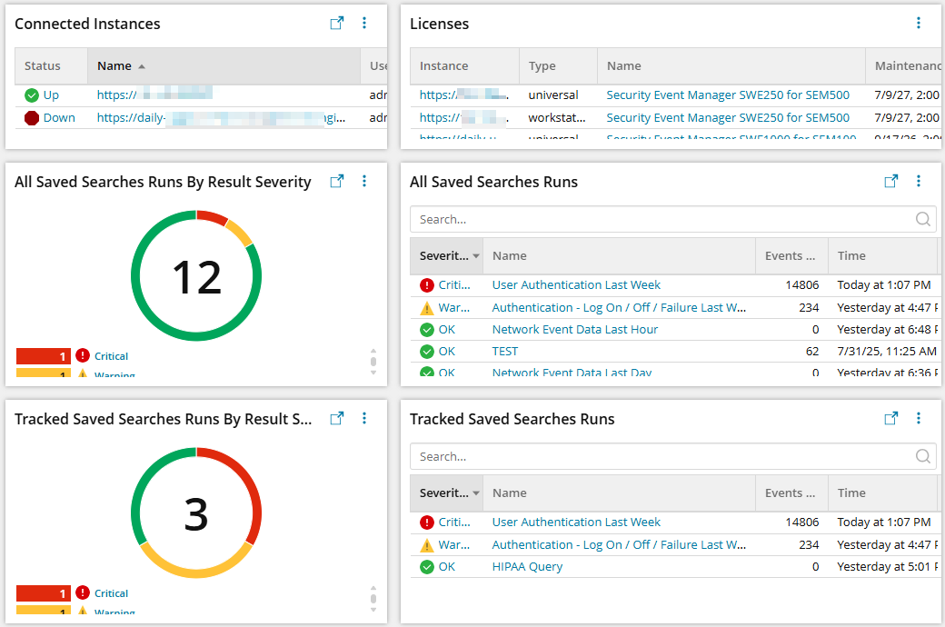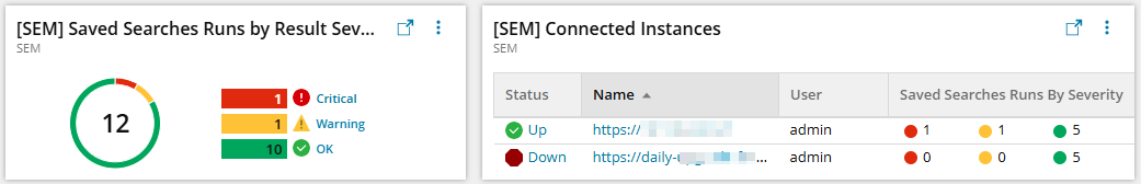 Tracked Saved Searches Runs - a table listing tracked saved search runs, grouped by severity, with more details, such as the events count, the related instance, or the last run time. Click an instance to go to the selected SEM Instance dashboard to view information related to the instance.