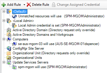se-aus-mgom-03domain to download a patch, the application uses theAUS-SE-MGOM-01\dspencercredentials to log in to the systems. Any resource (such as Active Directory Domains and Workgroups) that is not assigned to a rule defaults to theUnmatched resourcescredentials.