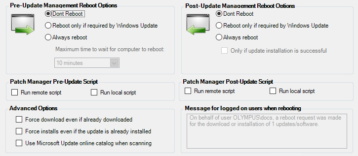 Select the Pre-Update and Post-Update Management reboot options that apply to the update, and click OK. For example, installing Mozilla Firefox on a client system does not require a system reboot. In this example, you can select Don't Reboot for both options. If the update required a reboot, you can add a message that displays on the client screen when their system is rebooted.