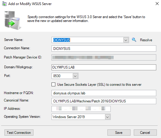 Click the Server Name drop-down menu, select the WSUS server, and click Save. If the remaining fields do not populate automatically, click Resolve.