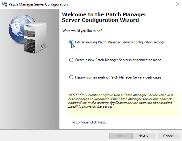 In the Patch Manager Server Configuration Wizard, select Edit an Existing Patch Manager Server configuration settings, and click Next.
