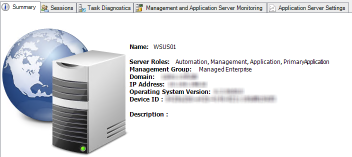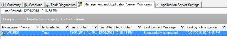This tab lists the Patch Manager servers with the Management or Application Server roles. This tab displays detailed information about the status of each server. In this example, WSUS01 is the management server.