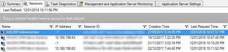 This tab displays details about the tasks currently running on the Automation Server role. These details also appear on the Task Diagnostics tab of the Management Servers node, which can contain details for several Application role servers.