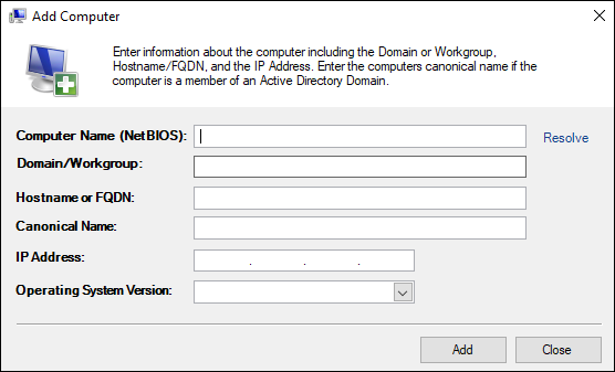 - In the Computer Name field, enter the computer name and click Resolve to autofill the remaining fields. If your DNS is set up correctly, clicking Resolve populates the remaining fields.