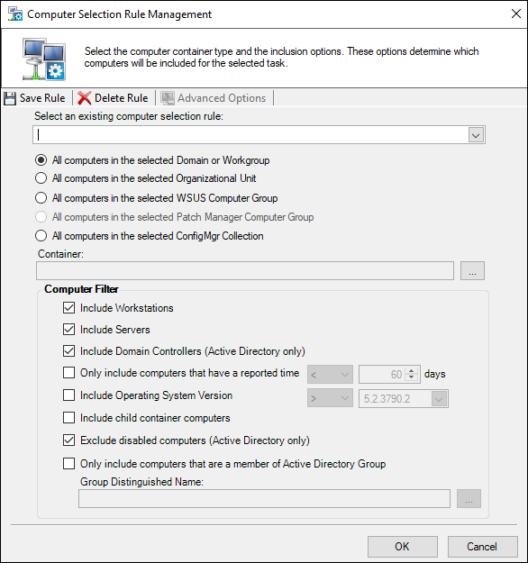 Click Select computers using rules in the Task Options Wizard to open the Computer Select Rule Management dialog box. Use this dialog box to select or define a computer selection rule to apply when the task runs.