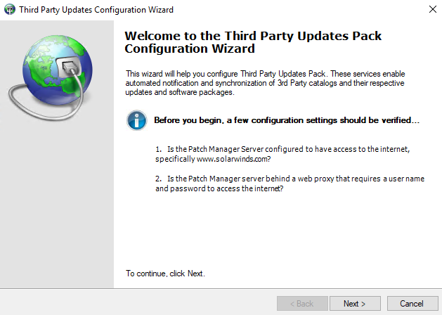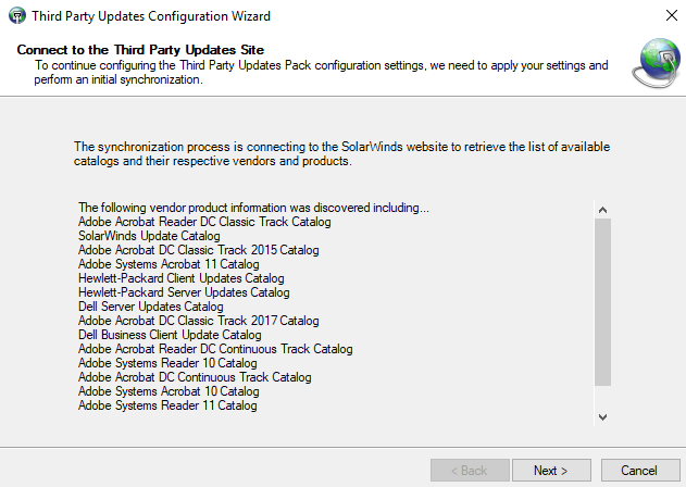 The SolarWinds Third Party Update Library contains third party update catalogs with software updates you can download to Patch Manager. To synchronize the library with Patch Manager, run the Third Party Updates Configuration Wizard. After you complete the wizard, Patch Manager contains the latest third-party updates you can upload to the WSUS server and apply to your managed systems.
