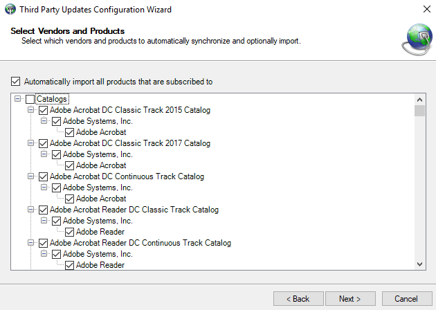 - Select the vendors and specific products you want to synchronize with the Patch Manager server, and click Next.