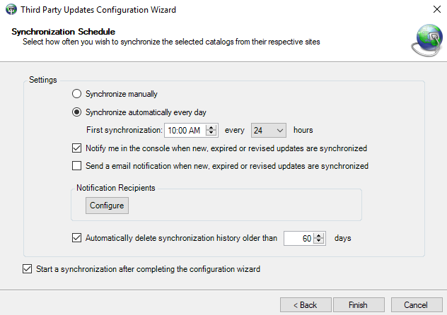 - Select the synchronization schedule settings that describe how often Patch Manager synchronizes your selected vendor catalogs and products.