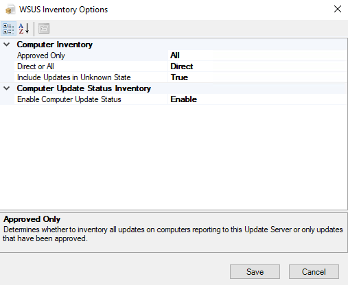 In the WSUS Inventory Options dialog box, select Direct or All. If you select Direct, WSUS inventory will only gather the data from computers directly reporting to the WSUS server for which the targeted inventory is configured. If you select All, the WSUS inventory will gather data about all computers reporting to upstream and downstream WSUS servers. Select this option if your WSUS servers are in Replica Mode with your upstream and downstream servers. Select an option to review the description.