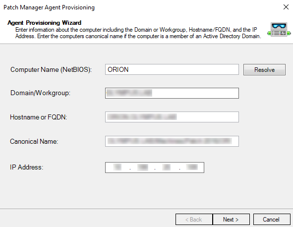 In the Agent Provisioning wizard, ensure that the host information is correct, and click Next.
