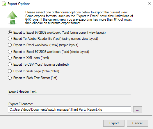 - In the Export Filename field, enter a new path to store the report or record the existing path for reference.