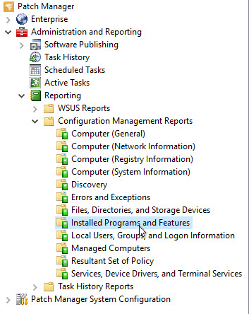 In the navigation pane, expand Administration and Reporting > Reporting > Configuration Management Reports and select Installed Programs and Features.