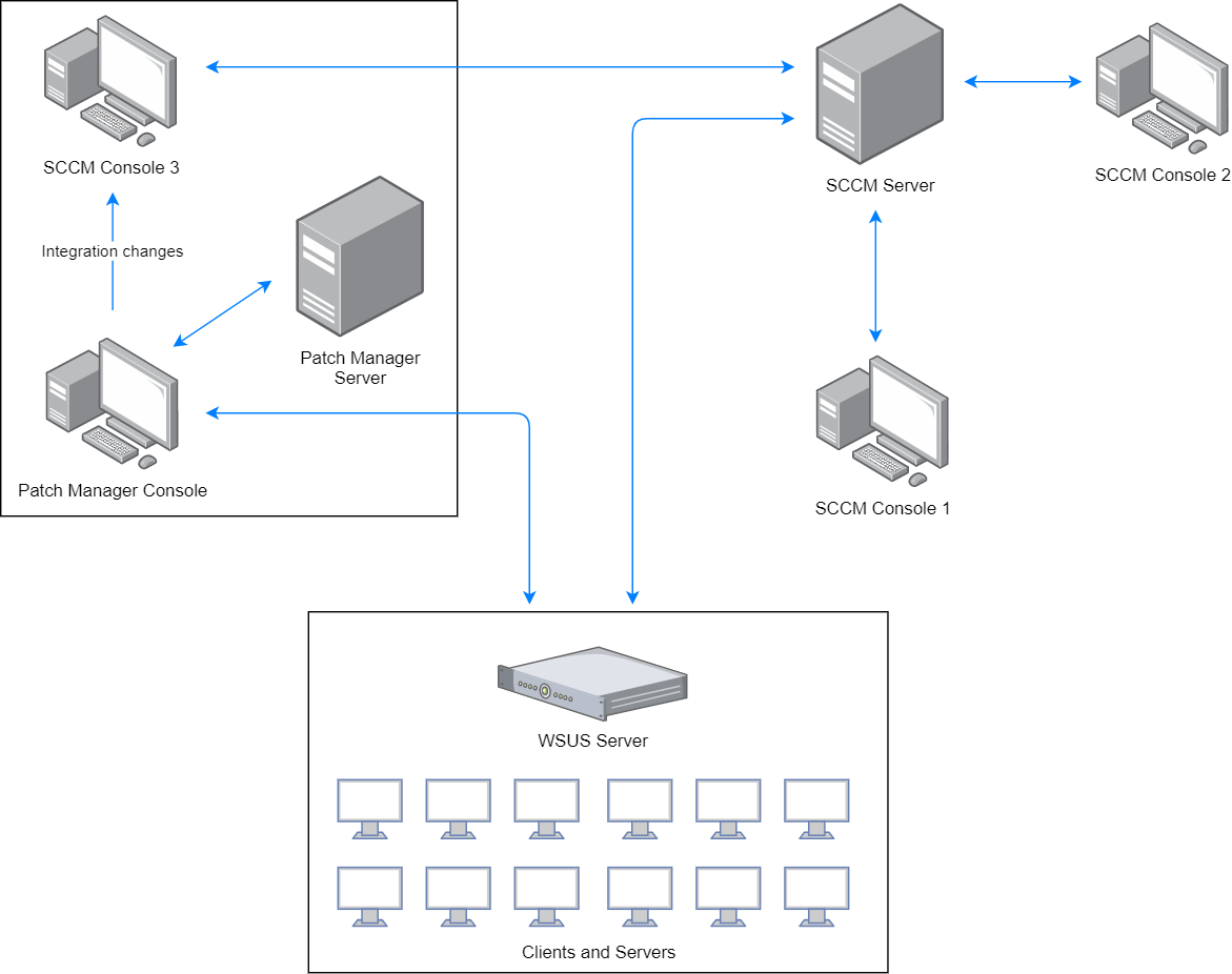 The Patch Manager Administrator Console communicates with the WSUS servers, while the SCCM console communicates with the WSUS servers through the SCCM server. Patch Manager does not modify the SCCM server, but integrates with the toolbar menus in the SCCM console to extend its functionality.
