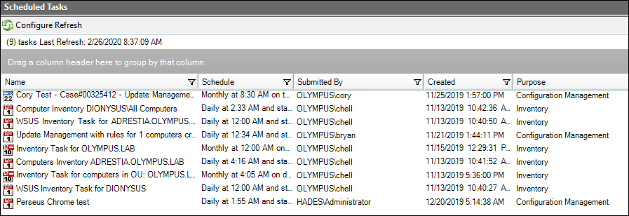 When you schedule a task to occur in the future or reoccur at a given time (such as daily, weekly, or monthly), Patch Manager stores these recurring tasks in the Scheduled Tasks node. This node allows you to view all scheduled tasks in your deployment. Use this node to run, view, or reschedule tasks to run at a future or recurring date and time.