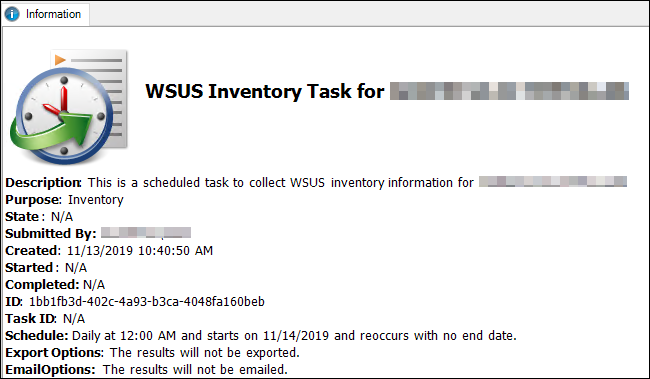 The Schedule column lists when each task is scheduled to run. When you select a task, the Information tab displays in the bottom center console with details about the task. You can review the task description, its purpose, when it is scheduled to run, and the task outcomes.
