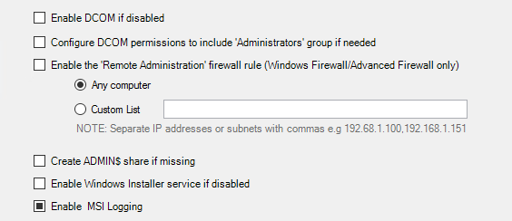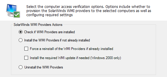 In the Computer Access Management window under SolarWinds WMI Provider Actions, select Install the WMI providers (if not already selected) and any additional options.