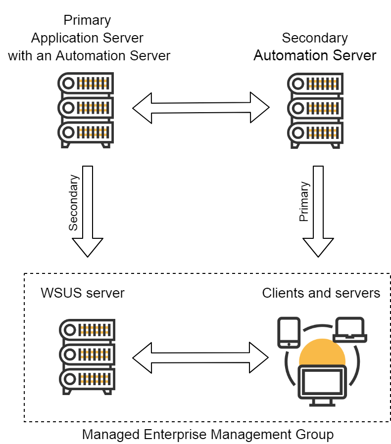 Additionally, you can install a separate Automation Server to offload task management from the PAS. Use the following configuration if the PAS cannot complete tasks quickly enough due to the number of managed clients in the local network. In this configuration, the Automation Server on the PAS provides a backup for the secondary Automation Server.