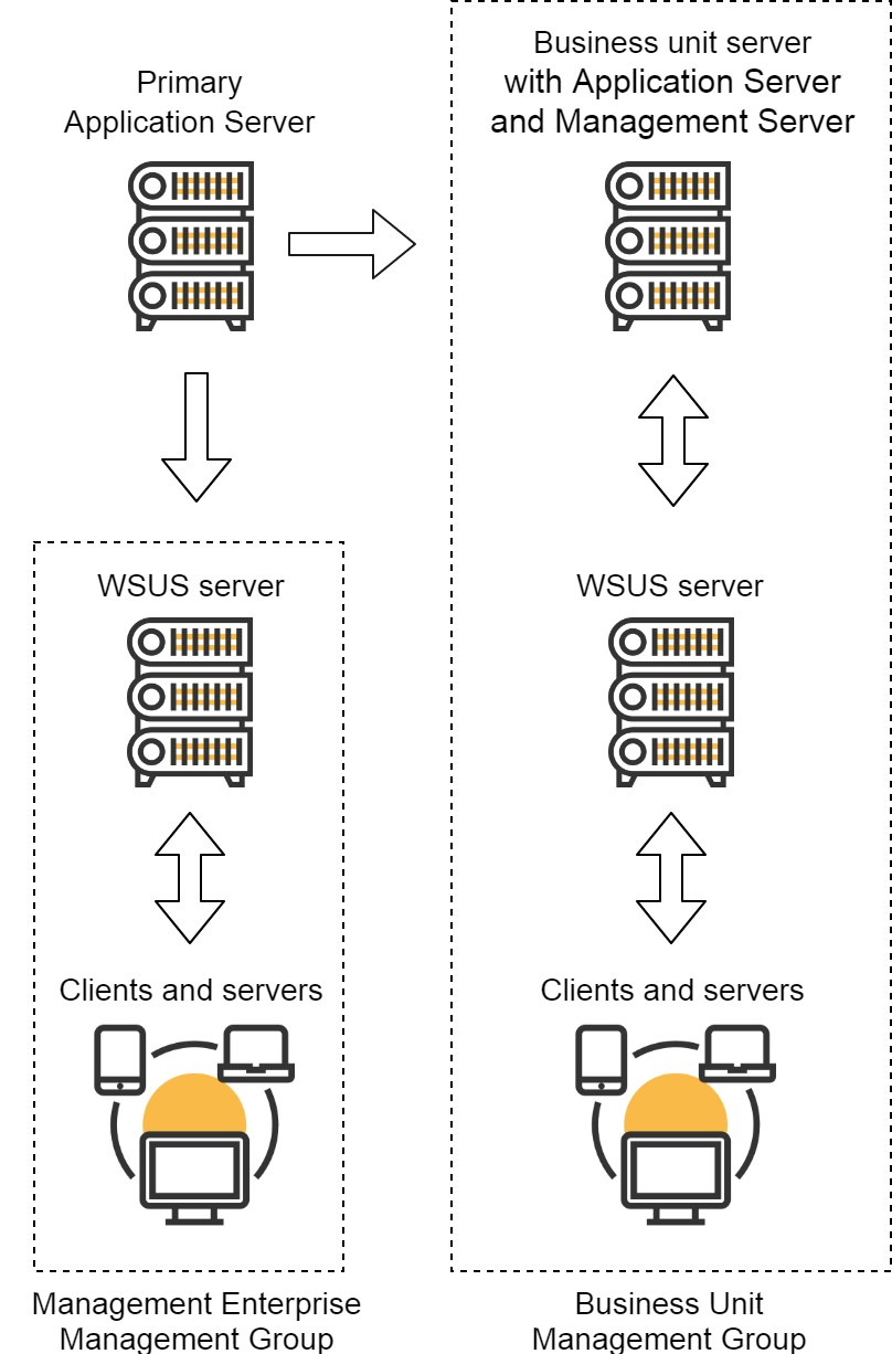This scenario shows a separate management group for the test environment resources. These resources should include the subdomain or workgroup for the environment and a dedicated WSUS server. A similar example would be to use an additional server for a special business or perimeter network (DMZ).