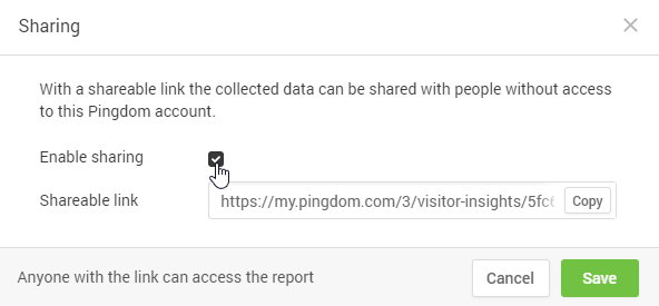 After Pingdom collects data from your monitored website, you can enable report sharing and share a report of the results with management and selected users within your organization.