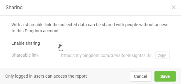 By default, all users who can access your Pingdom account can access a report. Your Pingdom account privileges allow you to decide who can access the report. When you enable report sharing, users who cannot access your account can access the shared report. You can disable report sharing at any time.