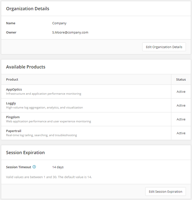 By default, a user can stay logged into SolarWinds Application Management products for 14 days before they are forced to re-authenticate. For security reasons, your company may require all user sessions to expire after a shorter time period. If security is not a concern, you can allow your users to continue to use the products for a longer time period before they have to re-authenticate. Your organization's session expiration settings can be found in the General Organization Settings.