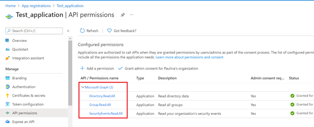 Credentials have the following Application-type permissions for Microsoft Graph: