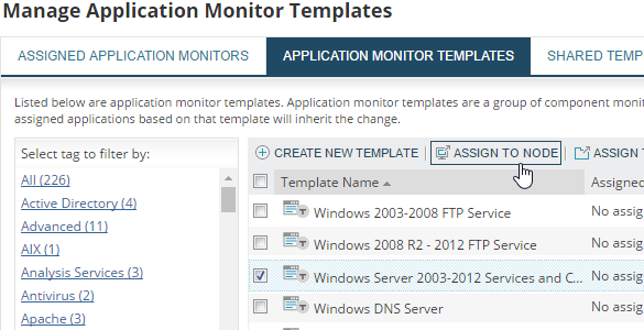 SAM provides over 250 out-of-the-box application monitor templates that you can use to monitor business-critical applications. You can assign these templates as-is to nodes, or create copies to modify settings or add and modify component monitors. SolarWinds recommends deploying a single template, making necessary edits to customize it to your environment, and then deploying the edited template on all similar applications. To learn more about templates, see Work with SAM application monitor templates.
