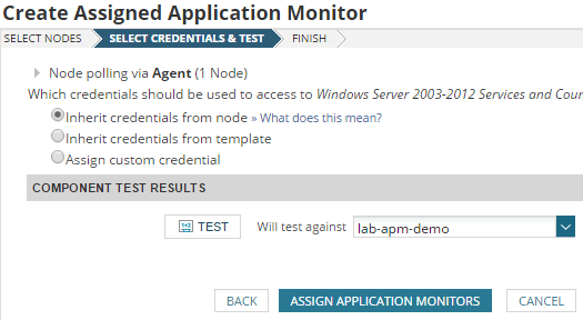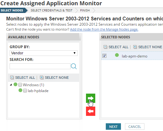 - Select the Windows nodes you want to monitor for the operating system on the left pane, click the green arrow to move it to the right pane, and click Next.