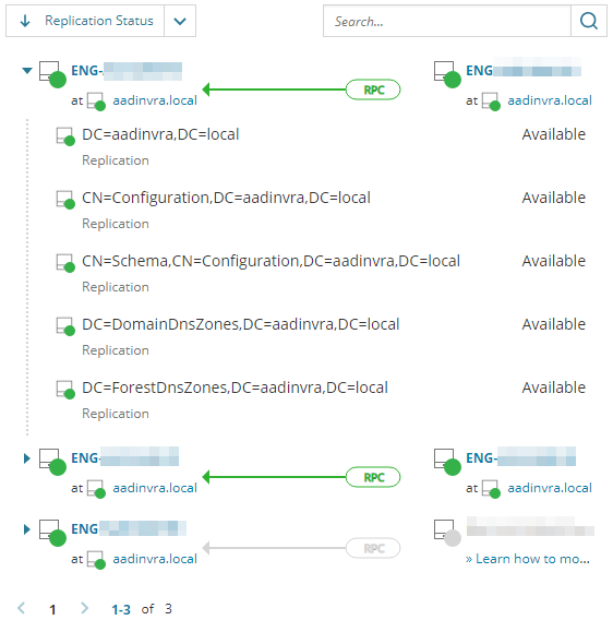 The Replication widget displays domain controllers (shown on the right, below) that replicate with the monitored domain controller (shown on the left) in the same domain, by design.