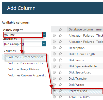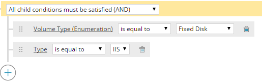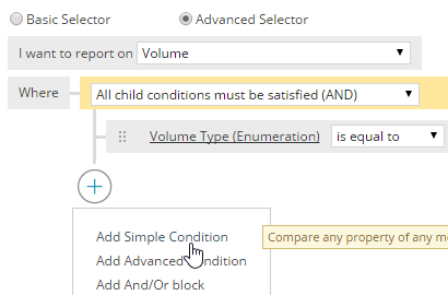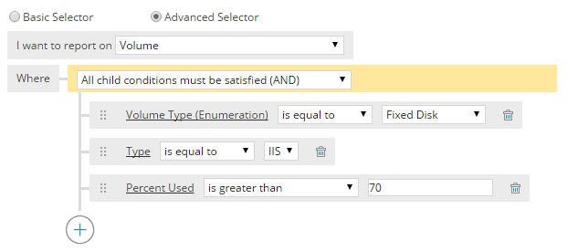 - Add another simple condition, and locate and select Percent Used under Volume Current Statistics.