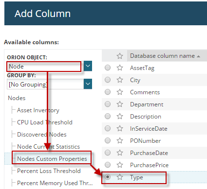 - Click Select Field, and then locate and select Node > Nodes Custom Properties > Type.