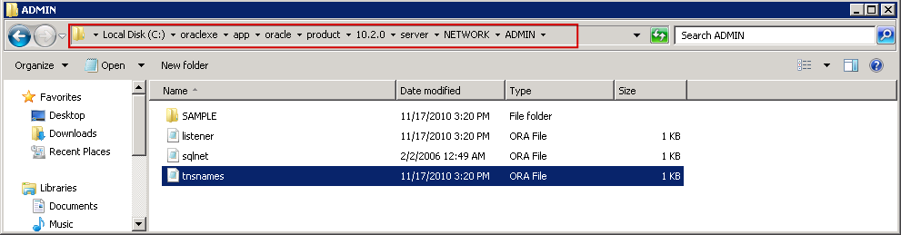 2. Navigate to the tnsnames.ora file. The default location is $ORACLE_HOME/network/admin/tnsnames.ora, where $ORACLE_HOME is the directory where the Oracle Server is installed.