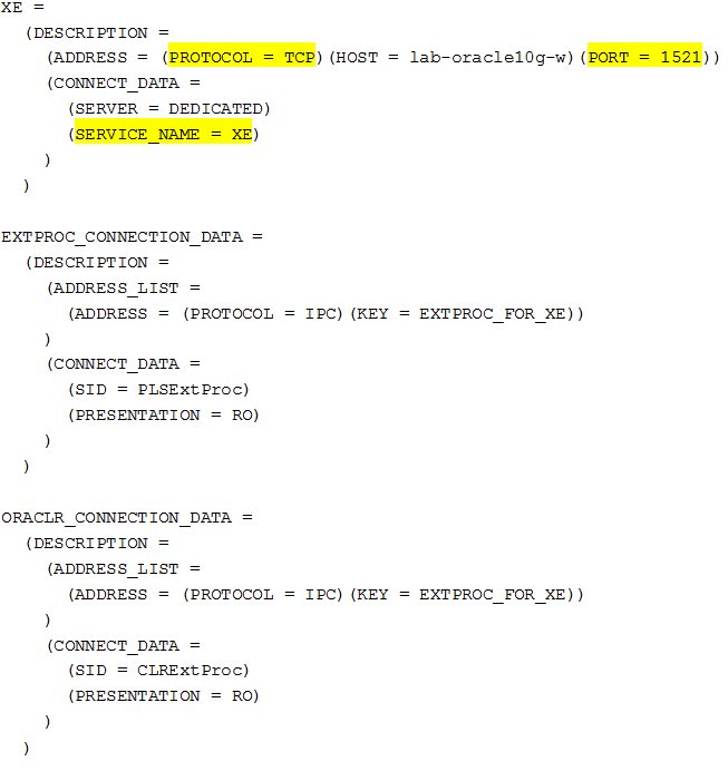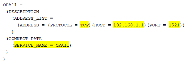 ORA11 = (DESCRIPTION = (ADDRESS_LIST = (ADDRESS = (PROTOCOL = TCP)(HOST = 127.0.0.1)(PORT = 1521)) (CONNECT_DATA = (SID = ORA11DATABASE)))