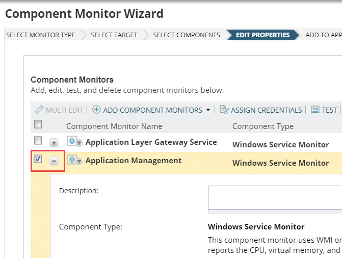 On the Edit Properties tab, customize each component monitor by selecting its check box and clicking [+].