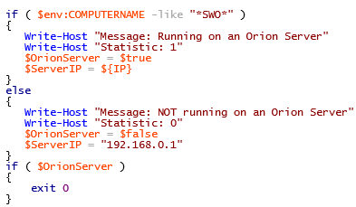 Use code to determine if you are testing code on the SolarWinds Platform server or target server. For example, the following PowerShell code returns a message identifying if the server is a test system or the SolarWinds Platform server: