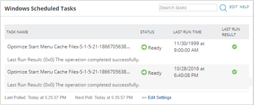 At the bottom of the widget, click Edit Settings to modify the Windows Scheduled Tasks monitor assigned to the node, which is based on the Windows Scheduled Tasks template.