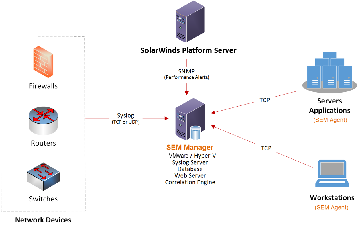 The SEM Manager relies on routers, firewalls, and switches to transmit syslog messages to the syslog server running on the SEM Manager. For a list of all ports required to communicate with SEM, see the Port requirements for all SolarWinds products.
