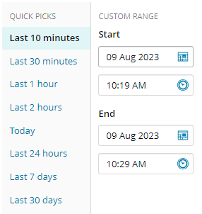 The Time Picker allows you to select a time period for the query. Click the time period link (for example, Last 10 minutes) to display results for your selected time period. You can use preset "quick picks" or create your own custom periods.