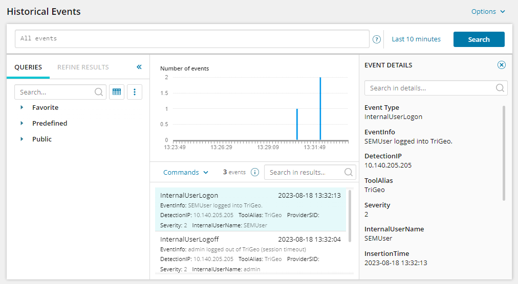 The Queries tab in the left column lists your saved historical event queries. All historical event queries are divided into four categories: Favorite, Predefined, Public and User-created, as shown below.