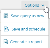 After you create a query, click Options in the toolbar to save the query, save and schedule the query, or generate a query report.