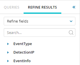 The Refine Results tab in the left column lists the fields available for filtering historical events by category. You can drag these fields into the Query Builder field when you create a search query.
