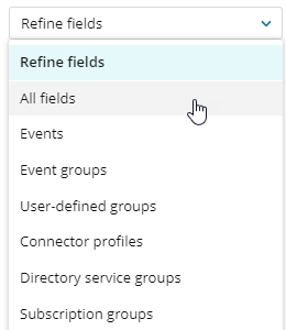 To organize the results by all fields, events, connector profiles, or specific groups, click the drop-down menu and select an option.