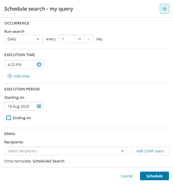 - Enter or select the email addresses to which you want the results of this query to be sent. You can add LDAP users if you have configured SEM for LDAP.